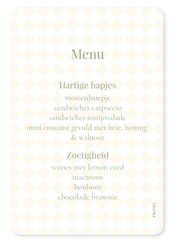 Wil je jouw zwangere vriendin of familielid in het zonnetje zetten met een babyshower? Maak het helemaal af met gezellige menukaarten. Zo kun je de tafel helemaal stylen in het thema. We hebben van dit ontwerp ook uitnodigingen, naamkaartjes & invulkaartjes.