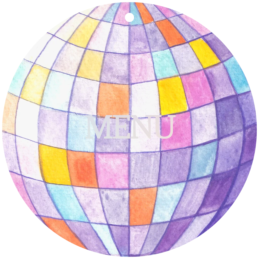 Maak je tafel decoratie compleet met dit menukaartje in de vorm van een discobal! De menukaart heeft een gaatje bovenin om met een touwtje het naamkaartje te kunnen bevestigen.