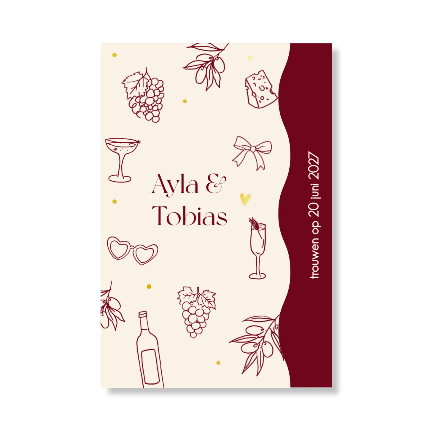 Een unieke trouwkaart met getekende elementen zoals een druiventros, olijven, cocktails, hartjeszonnebril en meer.