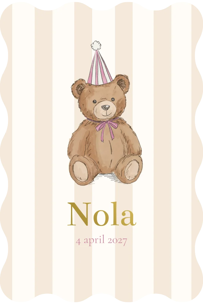 De achtergrond is uitgevoerd in beige en crème strepen. Het beertje is getekend in bruin met een muts en strik in roze. De naam is gedrukt in goudfolie, wat dit geboortekaartje een opvallend detail geeft.