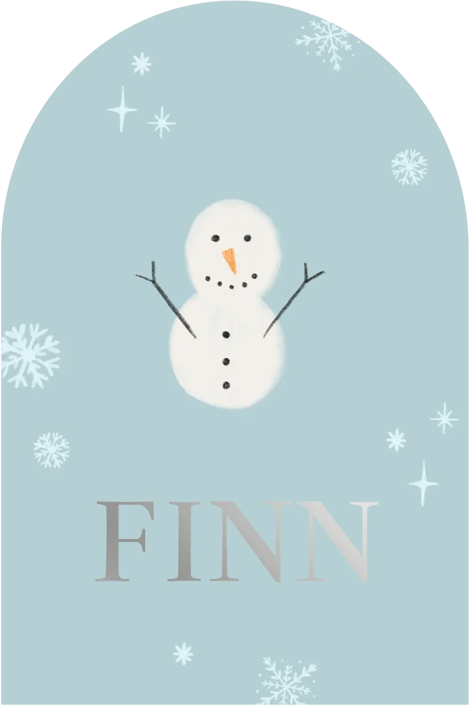 Een geboortekaartje in winters thema, voor jouw winterbaby. De lieve sneeuwpop staat centraal en de verschillende ijskristallen maken het af. De letters van de naam passen mooi door het zilverfolie