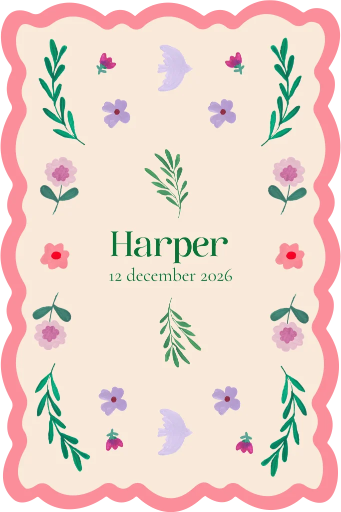 De kleuren staan in roze en lila op het kaartje. De details van de bloemetjes en takjes vormen een subtiel geheel binnen het ontwerp van dit geboortekaartje.