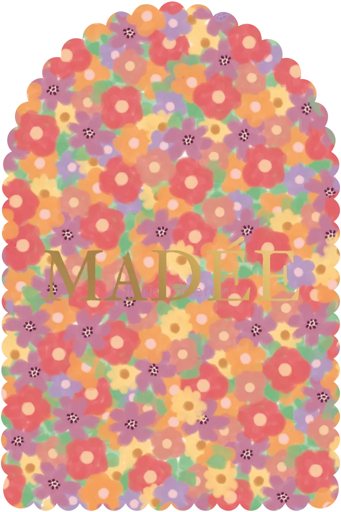Een mooi geboortekaartje voor een meisje in een halve boogvorm met fijne golfjes langs de randen. De voorkant is volledig gevuld met een bloemenpatroon. De naam staat groot over het design geplaatst.