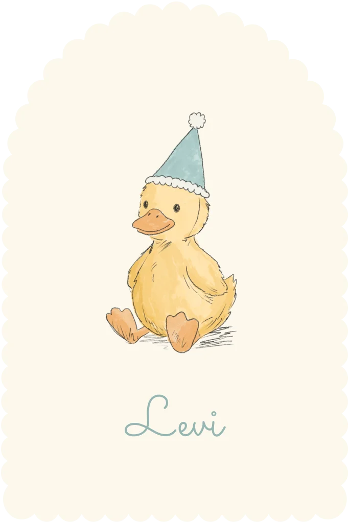 Een mooi geboortekaartje voor een jongen met een halve boogvorm en fijne golfjes langs de randen. Op de voorkant staat een getekend eendje met een muts. De naam staat onder de illustratie in een sierlijk lettertype.