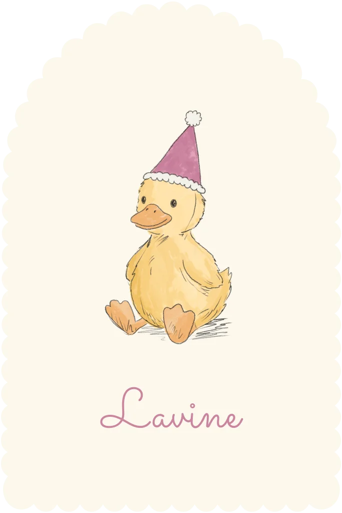 Een mooi geboortekaartje voor een meisje met een halve boogvorm en fijne golfjes langs de randen. Op de voorkant staat een getekend eendje met een muts. De naam staat onder de illustratie in een sierlijk lettertype.