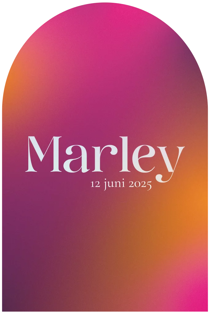 Bijzonder geboortekaartje met holografisch folie en een bijzondere achtergrond. De kleuren roze, paars & goud zijn gemengd in een verloop waardoor het net lijkt of je in de ruimte bent!