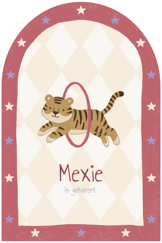 Een mooi geboortekaartje voor een meisje met een circus thema. Op het kaartje staat een tijger die door een hoepel springt binnen een boogvorm.