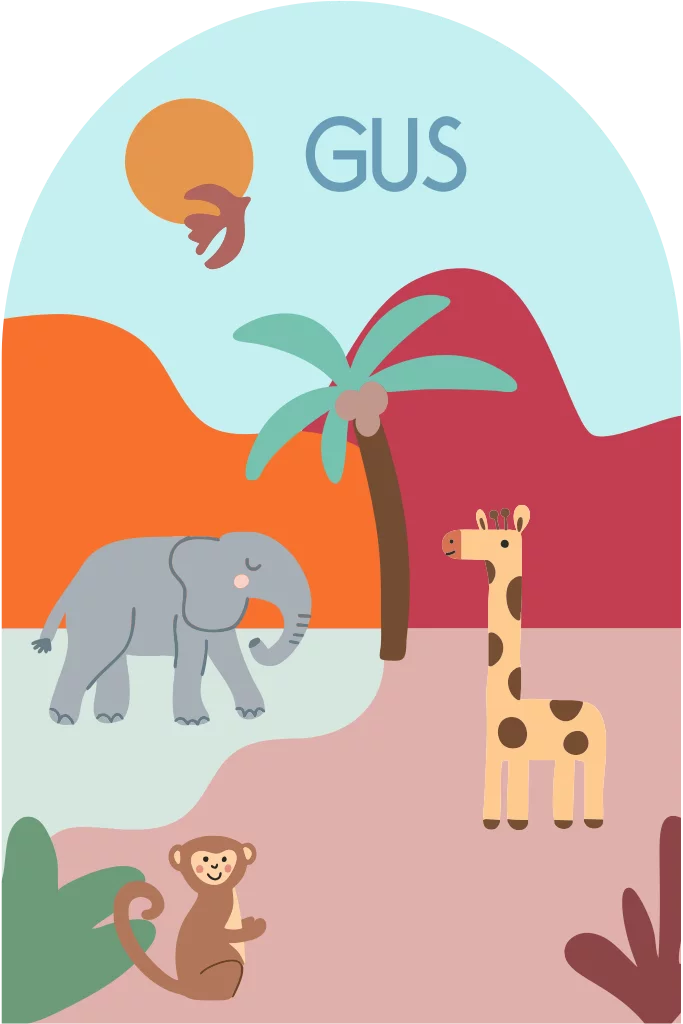 Een vrolijk geboortekaartje met dieren in een landschap. De vrolijke kleuren geeft het kaartje een fris en vrolijk geheel.