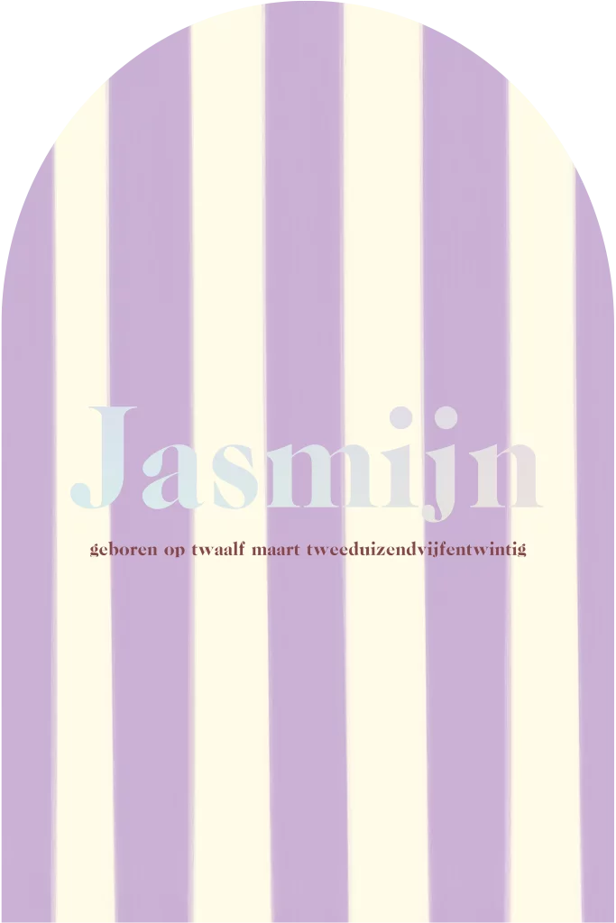 Schattig vrolijk geboortekaartje met strepen in lila en zachtgeel. De halve boog kaart geeft het een nog specialere touch.