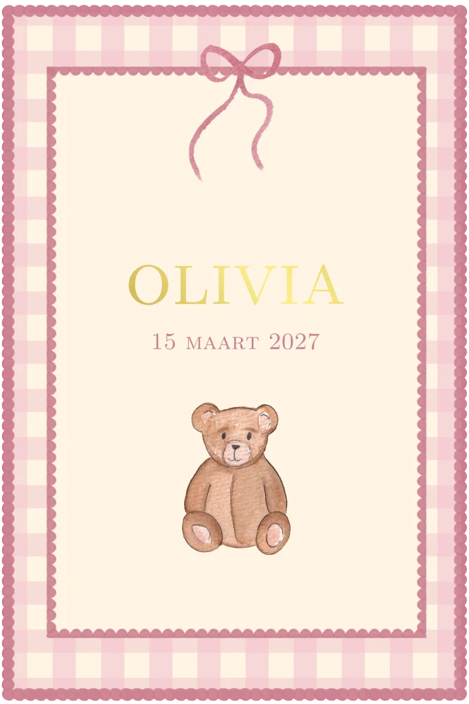 De kleuren staan in roze en vichy en geven het geboortekaartje een rustige en herkenbare opbouw. De elementen vormen samen een helder en verzorgd geheel.