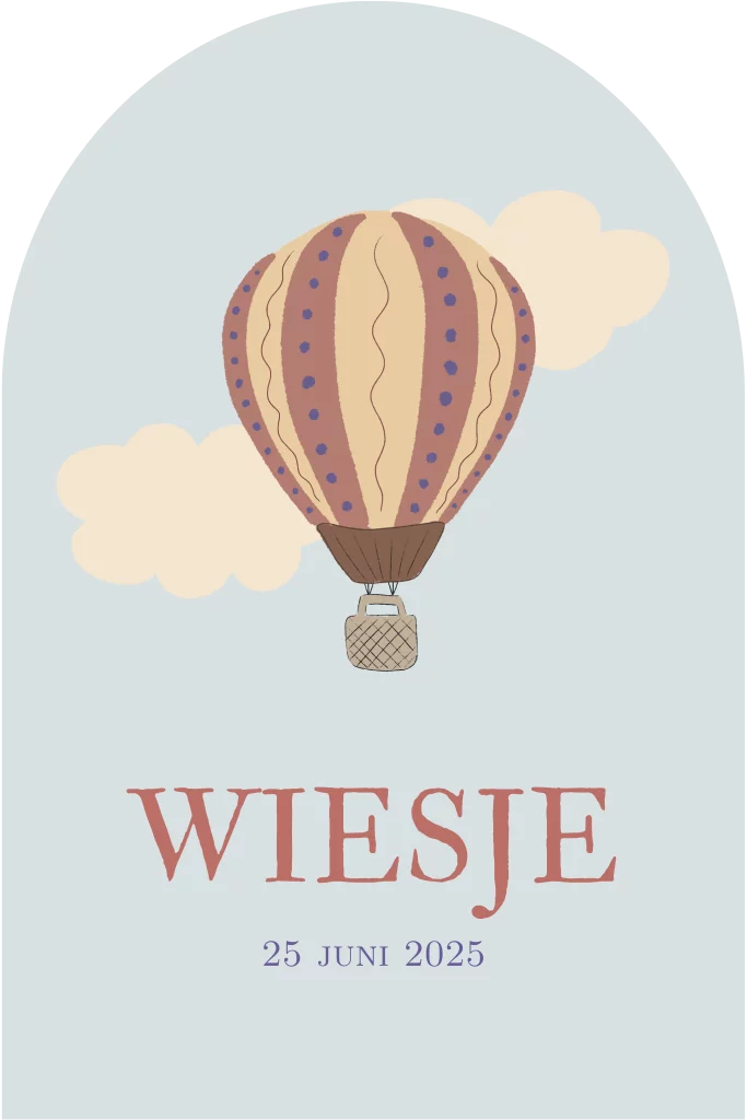 Een unieke illustratie met luchtballon en wolken op de voorkant van het geboortekaartje.