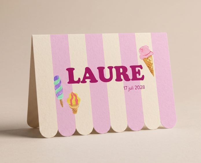 Dit geboortekaartje heeft een luifelvouw met een golvende voorkant.