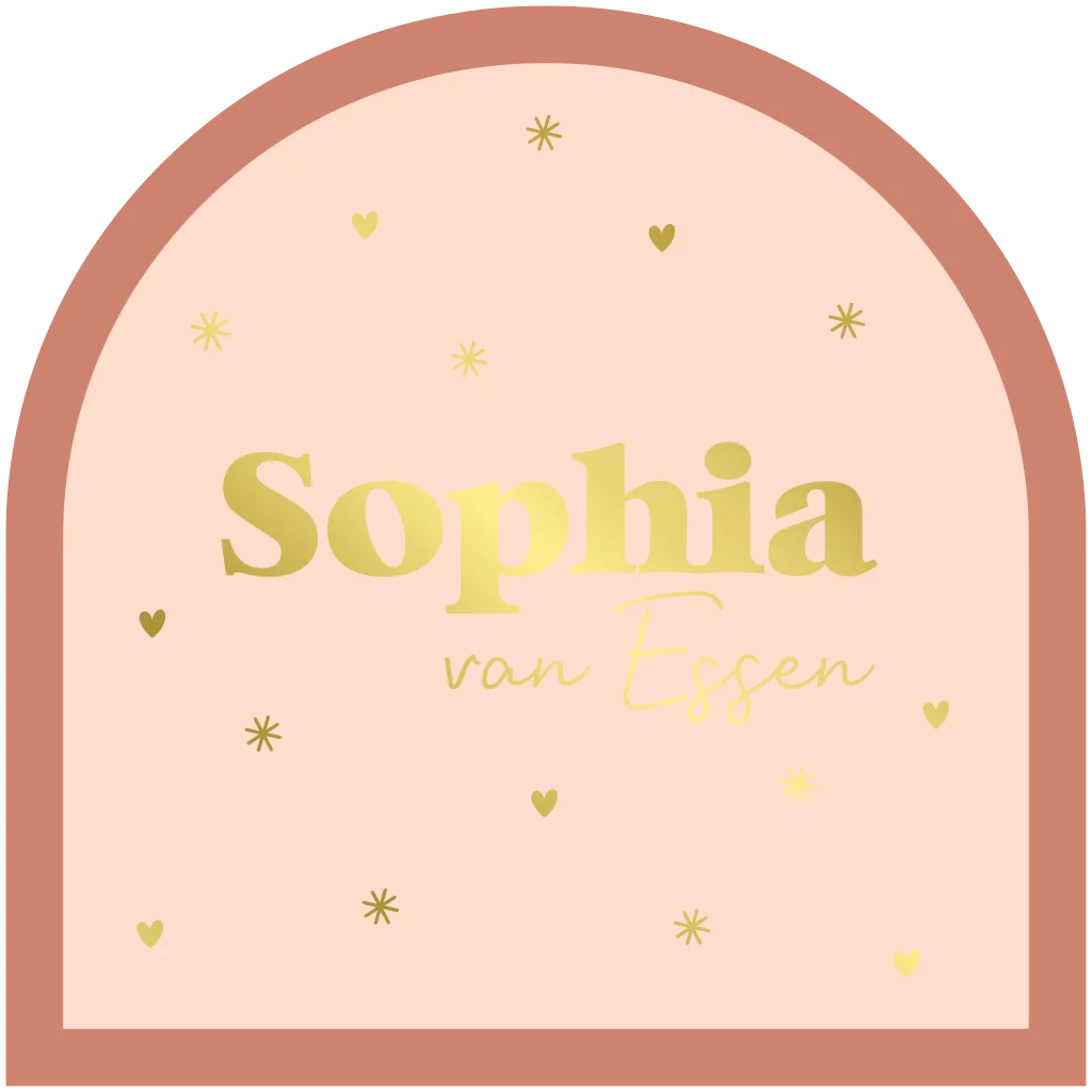 Dit geboortekaartje is uitgesneden in een halve boog en heeft een print in goudfolie van hartjes en sterretjes. De naam van jouw dochter springt er ook echt uit in goudfolie.