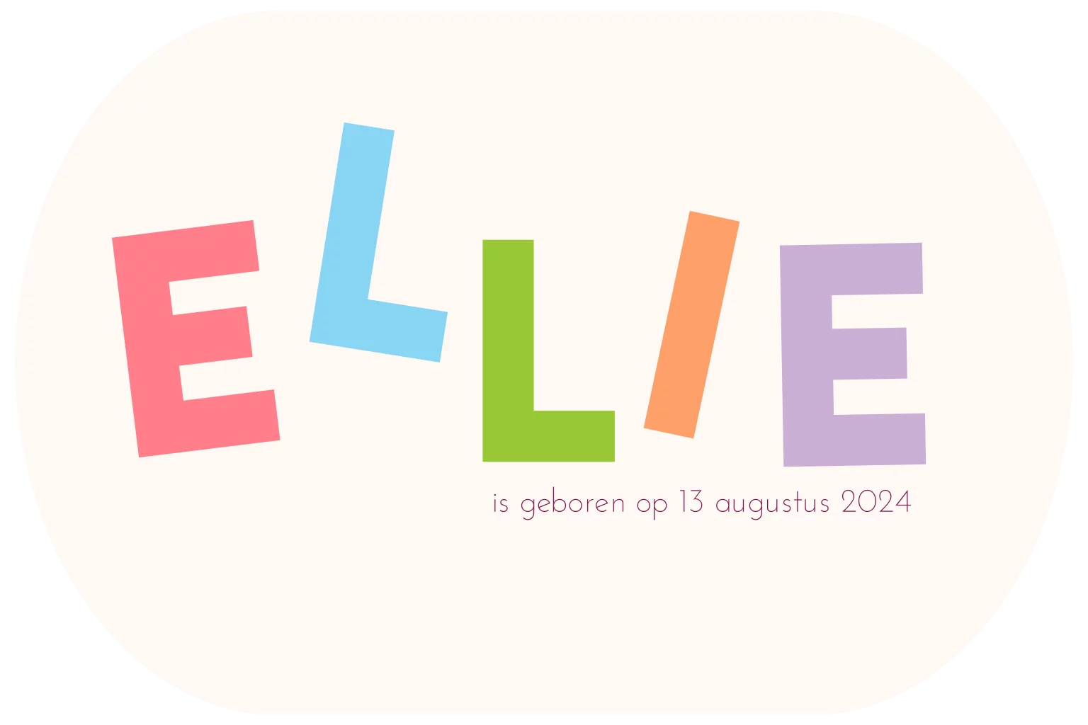 Uniek geboortekaartje in een ovale vorm met gekleurde letters op de voorzijde. De letters zijn in elke gewenste naam aan te passen. Kom je er niet uit? Stuur ons een mailtje!