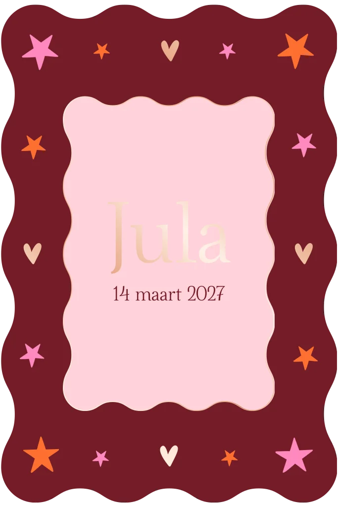 Ben je op zoek naar een uniek geboortekaartje in een echte trendkleur? Dan is dit geboortekaartje in burdungy met sterren en hartjes echt iets voor jou! Door het roségouden folie springt de naam er mooi uit. Dit folie kun je ook aanpassen naar andere kleuren.