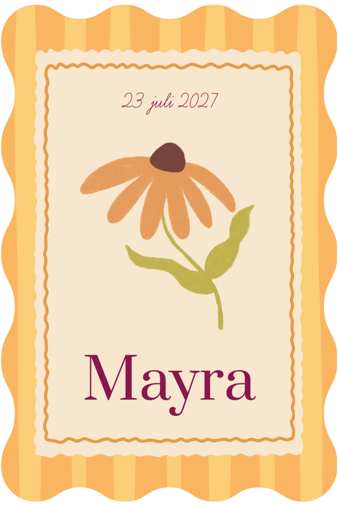 Een vrolijk geel geboortekaartje voor een meisje. Door de vorm en kleuren is het echt een perfect kaartje voor een lente of zomerbaby!