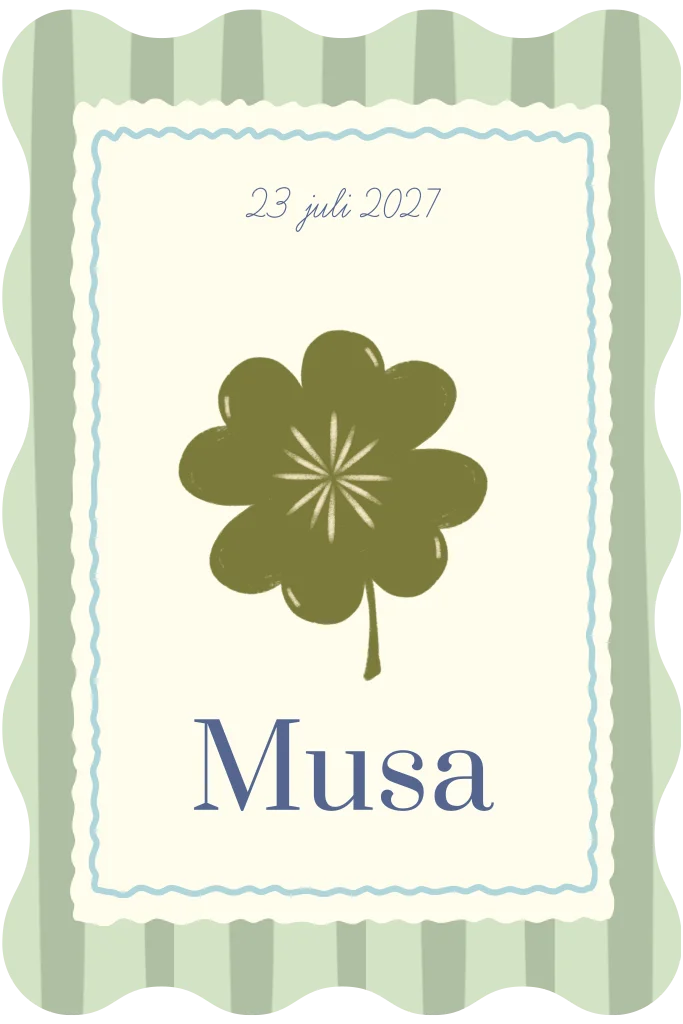 Het kaartje heeft een bijzondere golvende rand en fris streepjespatroon. Centraal op het kaartje staat een klavertje vier, wat natuurlijk staat voor geluk!