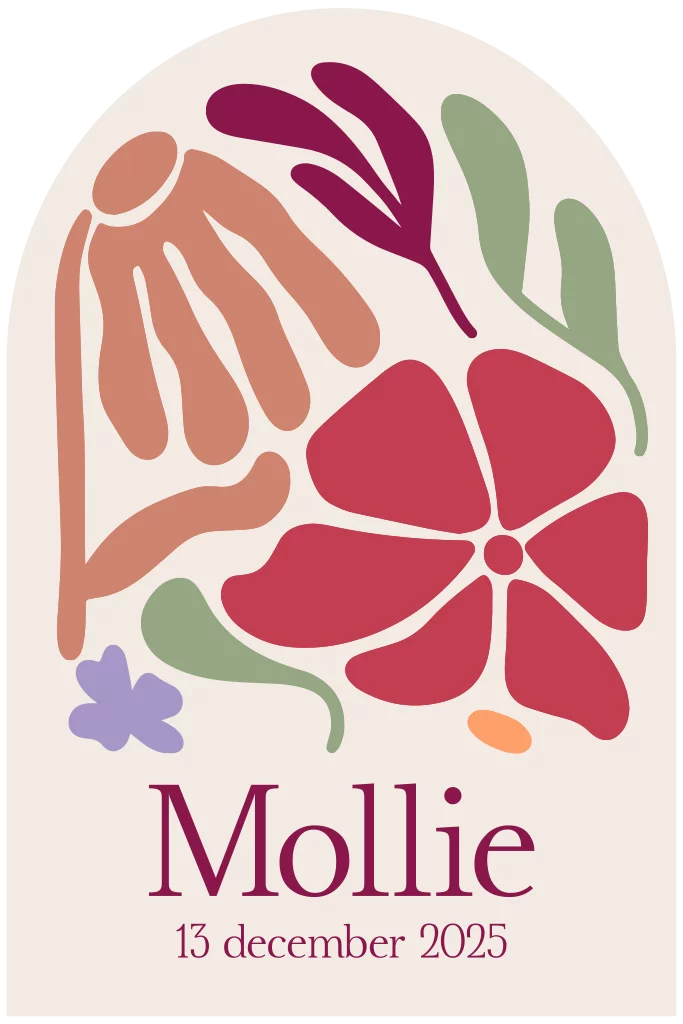 Bijzonder geboortekaartje in een halve boog vorm. De bloemen in verschillende kleuren op de voorkant maakt het kaartje helemaal af. De bloemen zijn gemakkelijk aan te passen in een andere kleur.