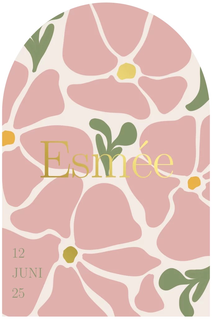 Dit meisjes geboortekaartje heeft een print van organische bloemen op de voorkant in prachtig roze. De naam is in goudfolie, waardoor deze er echt uit springt.