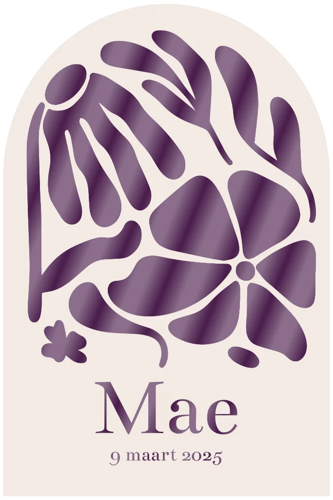 Classy en uniek geboortekaartje met bloemen in mooie donkerpaarse kleur.