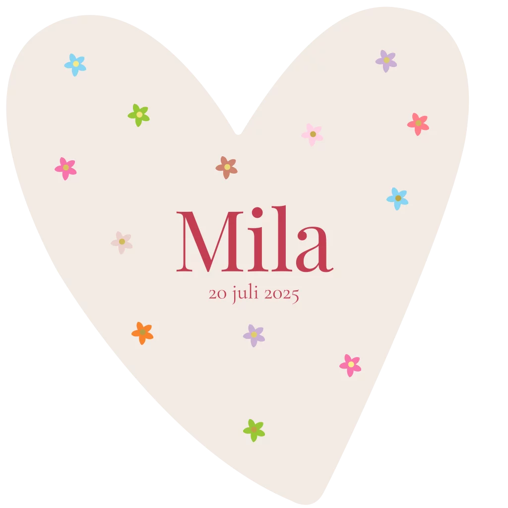 Schattig geboortekaartje in een hartvorm. Op de voorkant zijn er bloemetjes toegevoegd in verschillende kleuren met goudfolie. Zo is het kaartje vrolijk maar toch rustig.