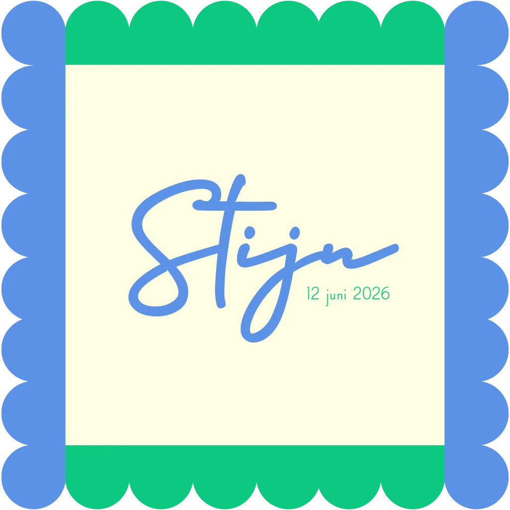 Kleurrijk vrolijk geboortekaartje met bolletjesrand in groen en blauw