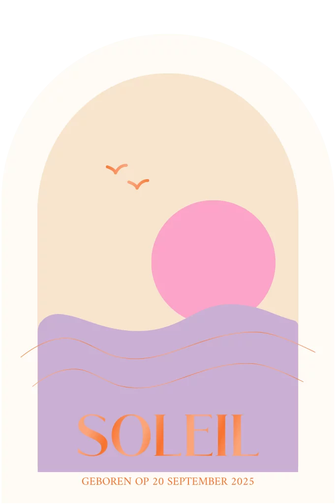 Een van onze bestsellers: dit unieke geboortekaartje met een zondergang met paarse achtergrond en roze & oranje.