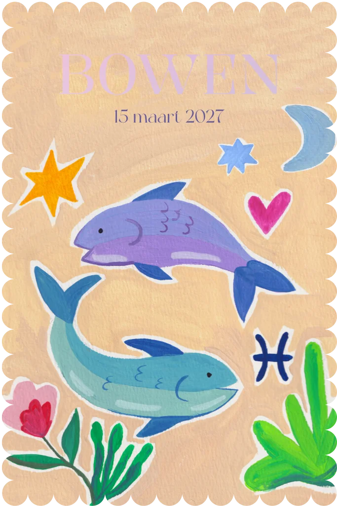 Een mooi geboortekaartje voor een jongen met een bolletjesrand en een illustratie rondom het sterrenbeeld Vissen. Op de voorkant staan twee vissen met verschillende kleine vormen zoals sterren en symbolen. Dit geboortekaartje past goed bij ouders die een sterrenbeeld willen verwerken in het ontwerp.