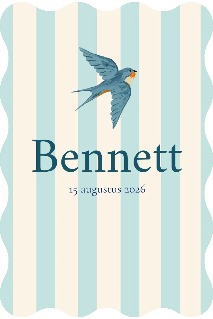 Een mooi geboortekaartje met een illustratie van een zwaluw in vlucht. Het kaartje heeft een rustige opmaak met verticale streepjes en een golvende vorm rondom de rand.