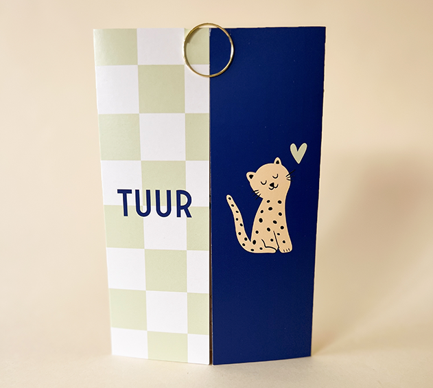 Een uniek geboortekaartje in theatervouw formaat met blokjespatroon en een schattige luipaard. De voorkant heeft 2 'deurtjes' waardoor het een uniek geheel krijgt. Je kunt met een mooi passend lint of paperclip aan het kaartje vastmaken.