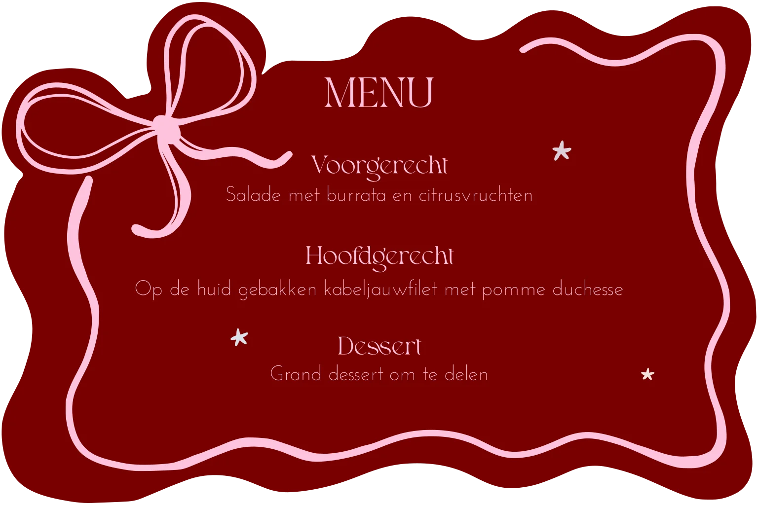 Prachtige hippe menukaart in een mooie golvende vorm met een strik in de trendkleuren roze en burgundy rood.