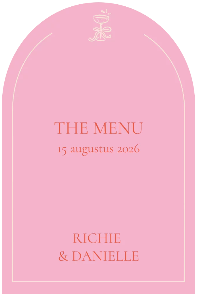 Een menukaart in een boogvorm met een mooie liefdevolle roze kleur met beige elementen en rood/oranje tekst.
