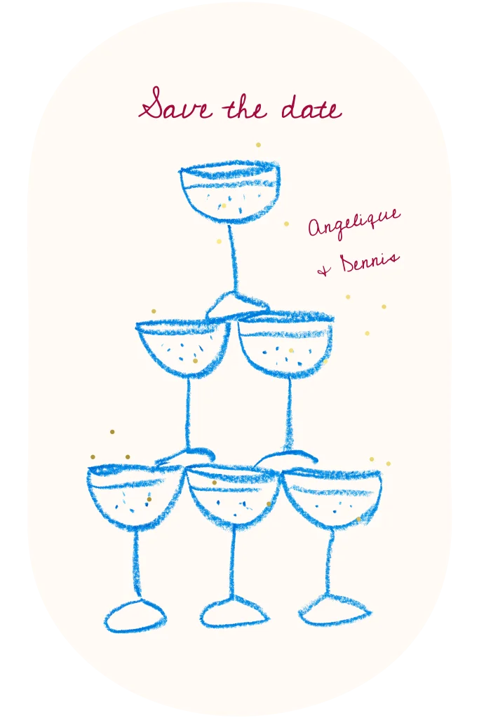 Hippe trouw uitnodiging met een getekende illustratie erop van een champagnetoren. Het goudfolie maakt het helemaal af!