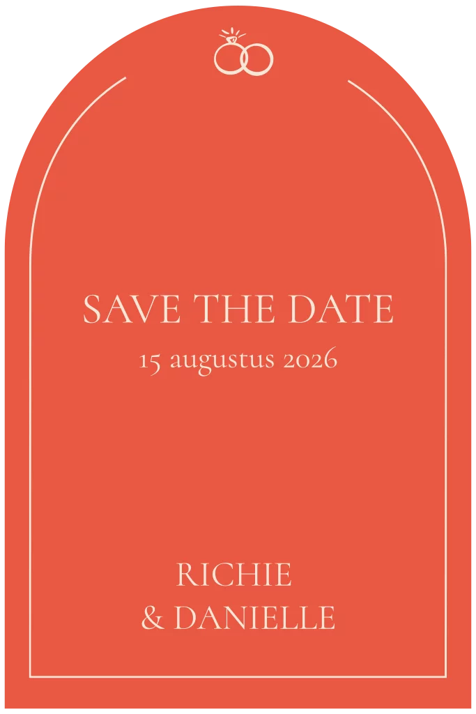 Een save the date in een boogvormige kaart met een mooie liefdevolle rode / oranje kleur.