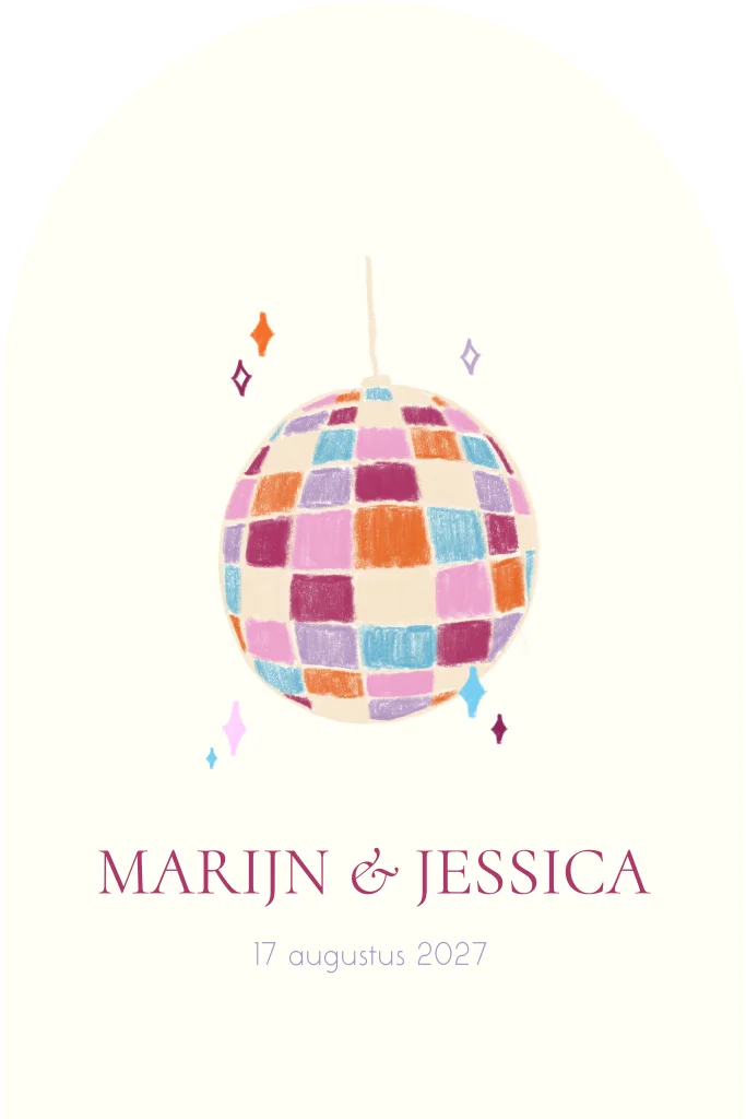 Halve boog uitnodiging met een geïllustreerde discobal centraal op de voorzijde. De discobal is geschilderd in blokken roze, paars, oranje en blauw, verdeeld over een lichte ondergrond. Rondom de bal staan kleine gekleurde accenten in dezelfde tinten. Onder de illustratie staan de namen Marijn & Jessica in een roodroze serif lettertype, met daaronder de datum 17 augustus 2027 in een zachte paarse kleur.