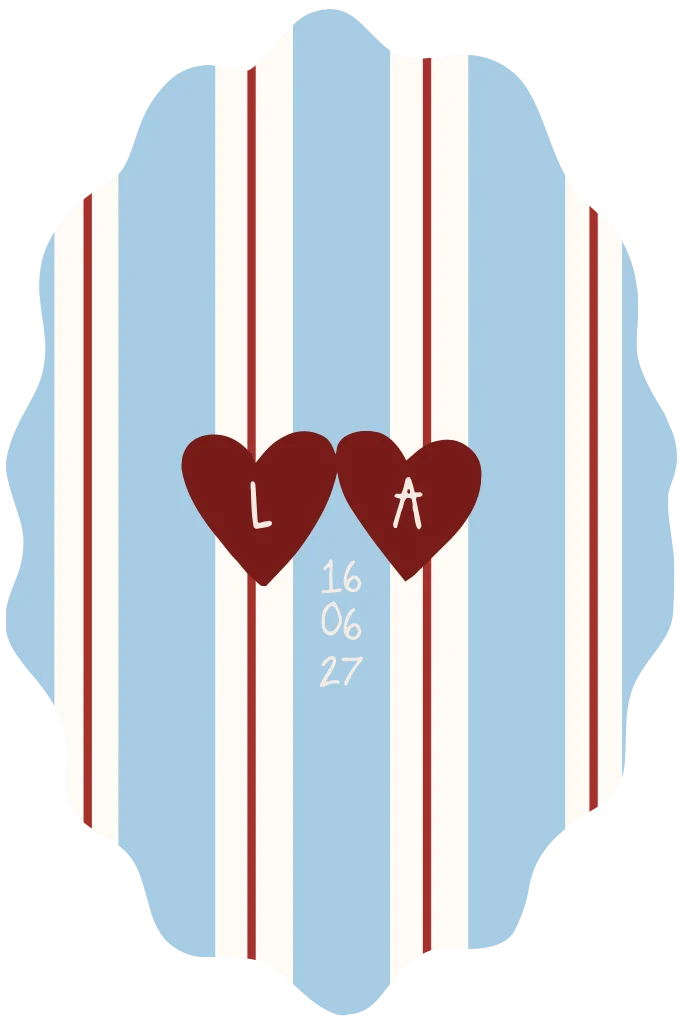 Unieke trouwkaart in een golvende vorm met streepjes en 2 hartjes met de initialen van het bruidspaar.