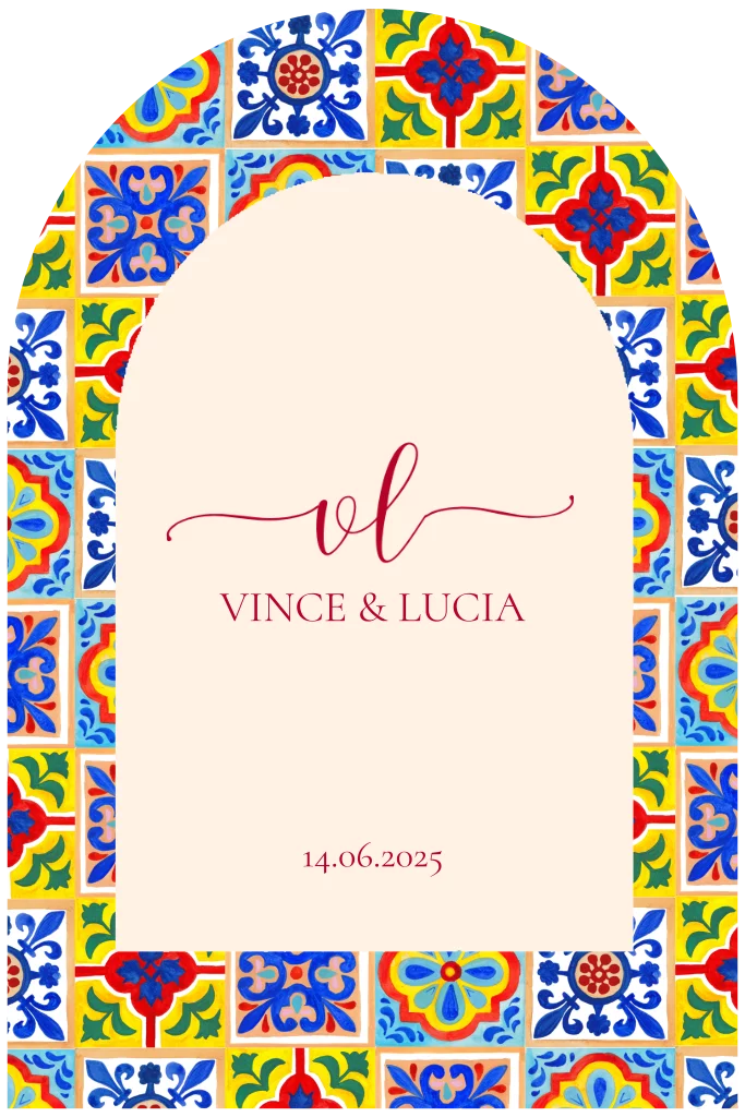 Unieke trouwuitnodiging met prachtige spaanse tegels, door ons geschilderd in gouache.