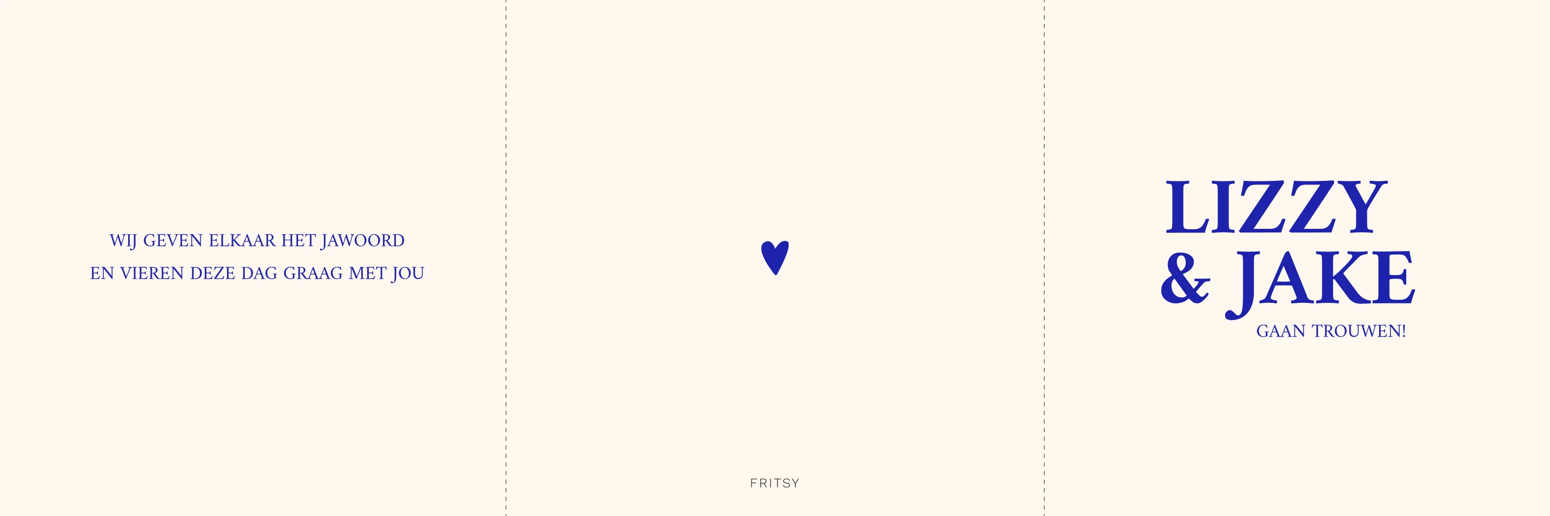 Op zoek naar een unieke trouwkaart die de perfecte sfeer voor jullie speciale dag weerspiegelt? Ontdek onze prachtige drieluik trouwkaart in een betoverende kobalt blauwe kleur. Met zijn minimalistische design en speciale vouwvorm is deze kaart een echt uniek pronkstuk. De diepe blauwe kleur brengt een gevoel van rust en elegantie, terwijl het drieluik ontwerp een vleugje originaliteit toevoegt. Deze kaart is perfect voor koppels die op zoek zijn naar een stijlvolle en kleurrijke uitnodiging. Of het nu voor een intieme ceremonie is of een groots feest, de kobalt blauwe trouwkaart zal de toon zetten voor een onvergetelijke dag.