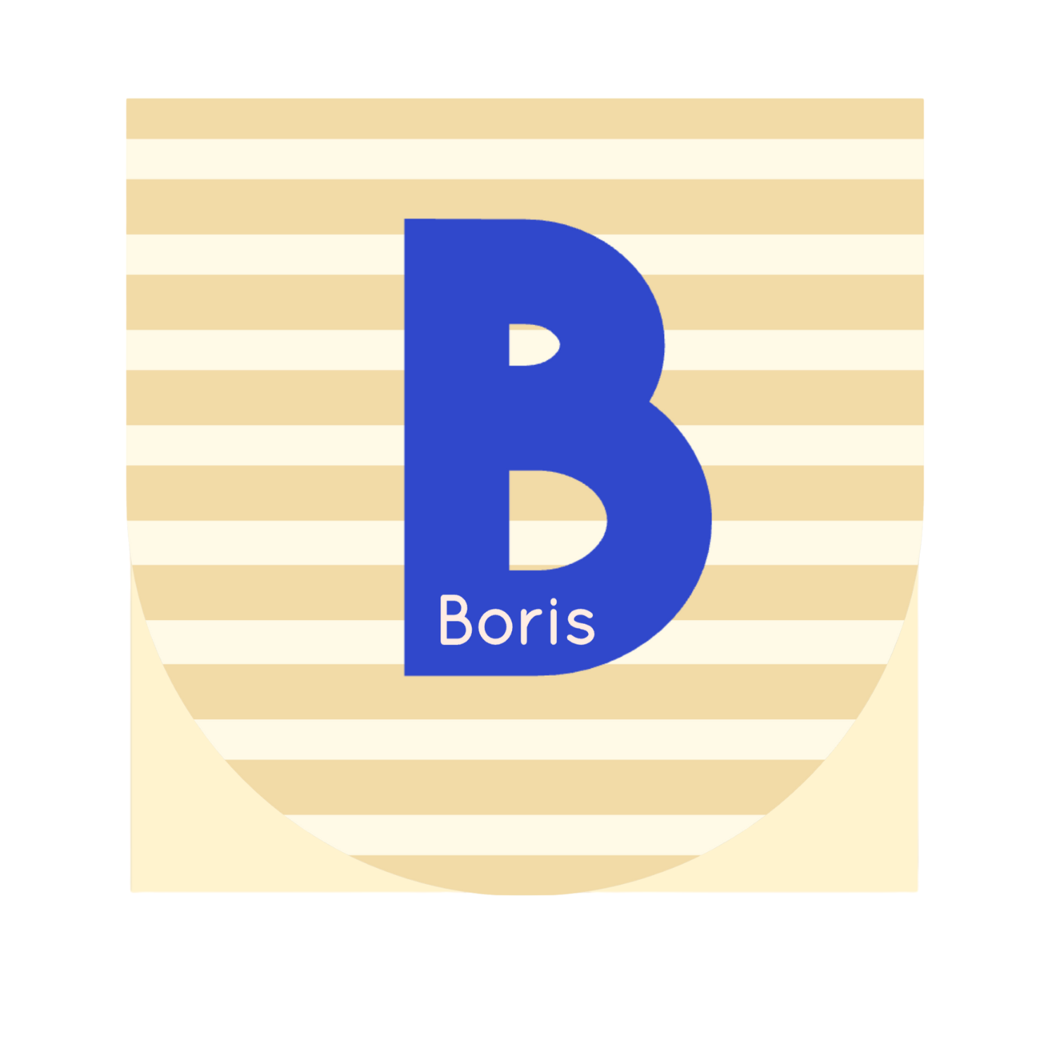 Een mooi geboortekaartje voor een jongen met een geel gestreepte voorkant en een grote knalblauwe letter B. Het kaartje heeft een ronde voorkant en een vierkante achterzijde. Door deze vorm zie je de kleur van de binnenkant wanneer het geboortekaartje dichtgeklapt is.