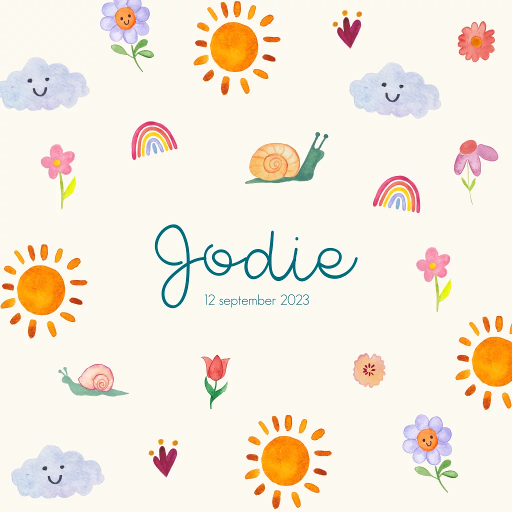 Lief geboortekaartje voor een meisje met een zonnetje, bloemetjes en slakje in vrolijke kleuren.