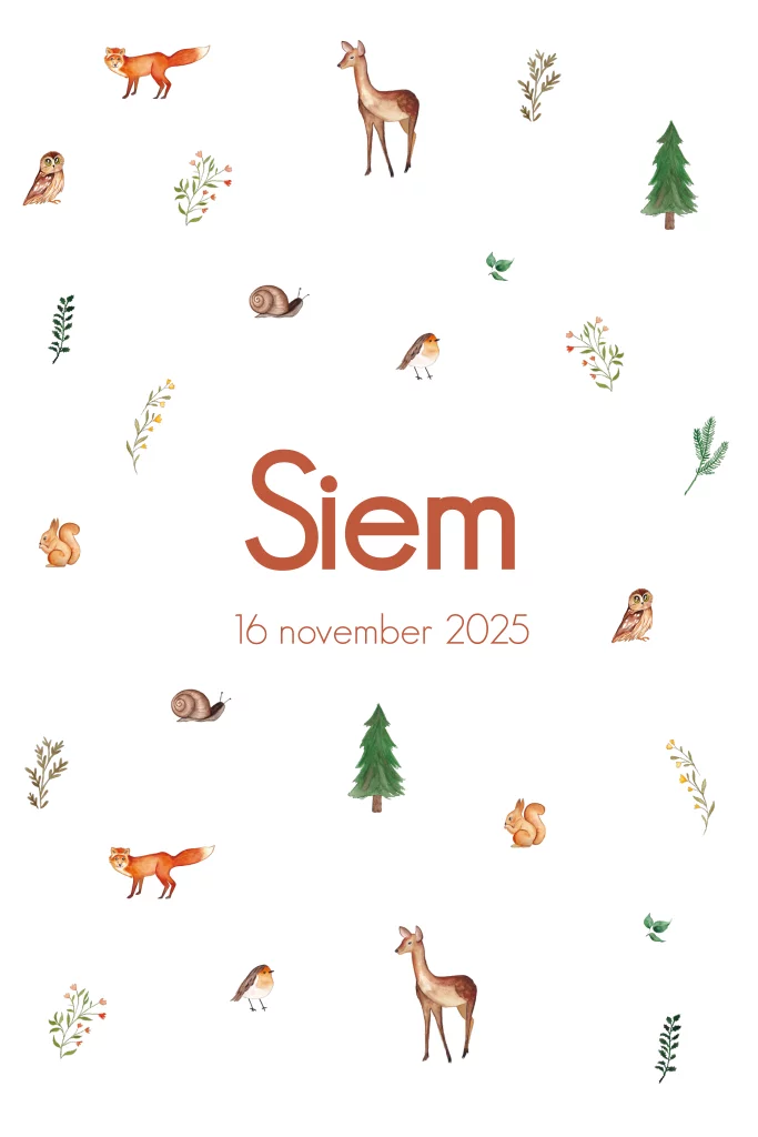 Schattig geboortekaartje met verschillende bosdieren zoals een vos, uil, slak, eekhoorn, mus & hertje.