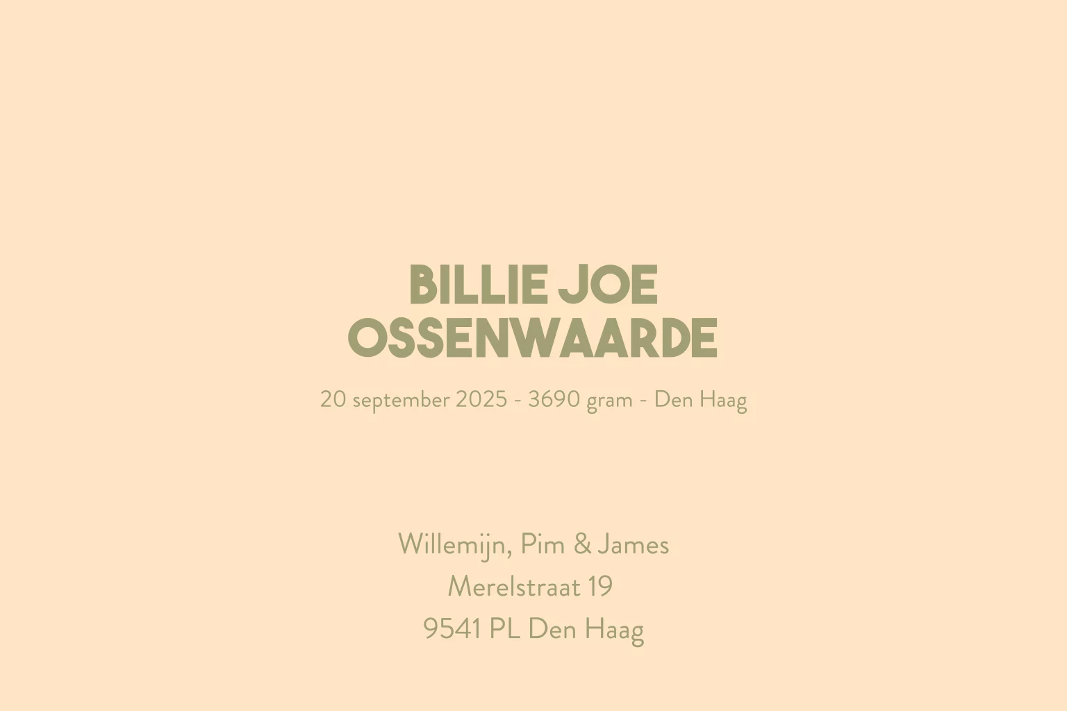 Op de voorzijde van dit kaartje is de naam van jouw baby in legergroen met doorschijnende letters voor een speels effect op een mooie rustige beige achtergrond.