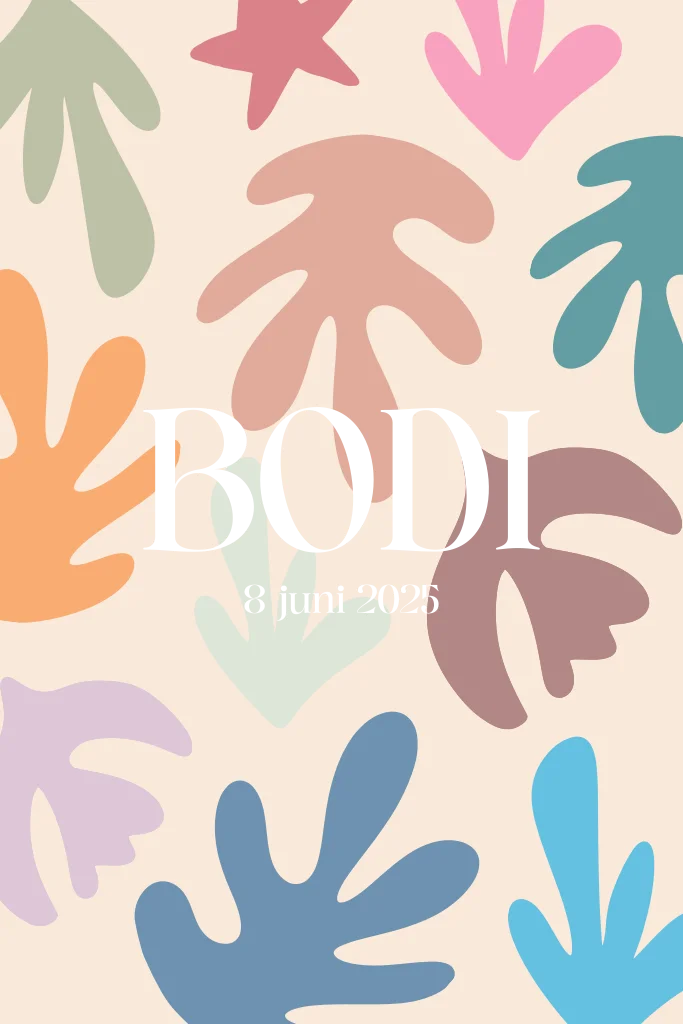 Dit kleurrijke geboortekaartje heeft organische vormen die lijken op bloemen en planten.