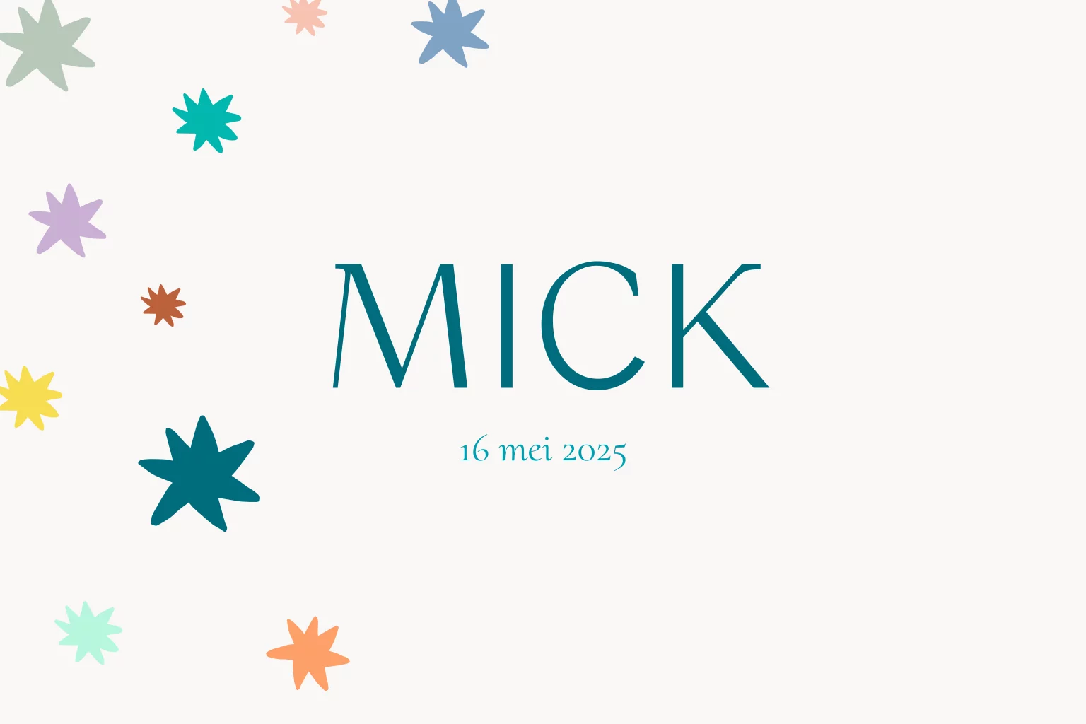 Clean geboortekaartje met gekleurde sterretjes en beige achtergrond.