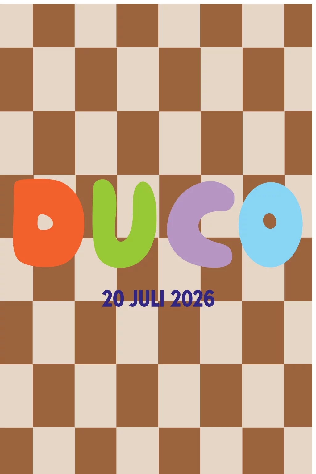 Stoere raamsticker met blokjespatroon en vrolijke gekleurde letters.