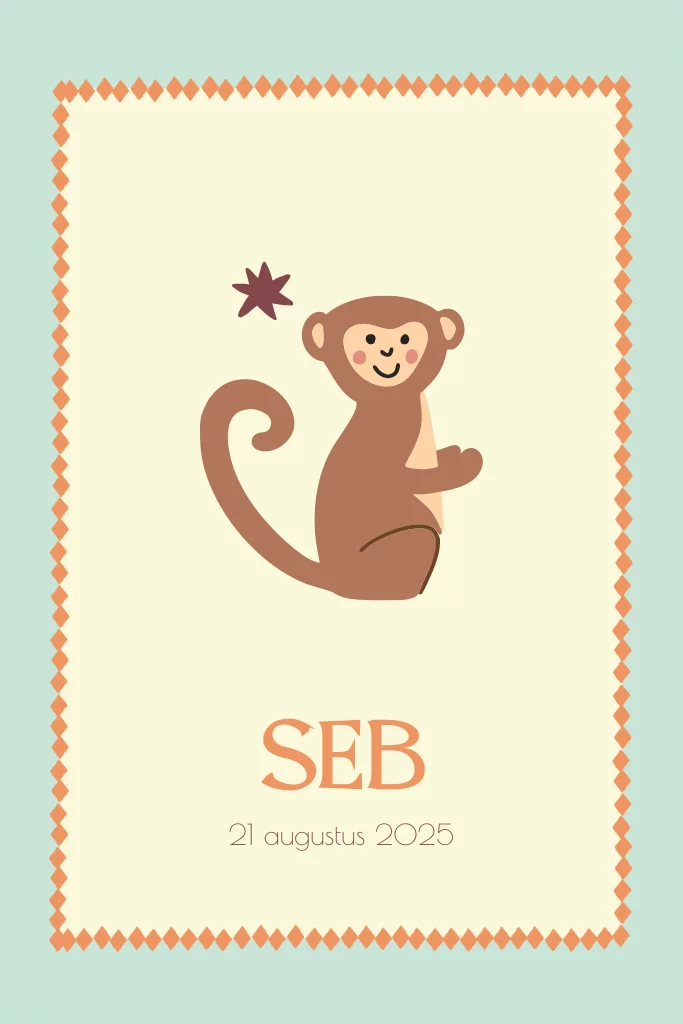 Een schattig kaartje met een lief aapje op de voorkant en vrolijke kleurtjes.