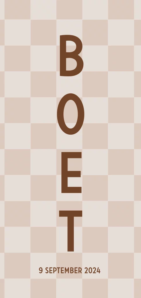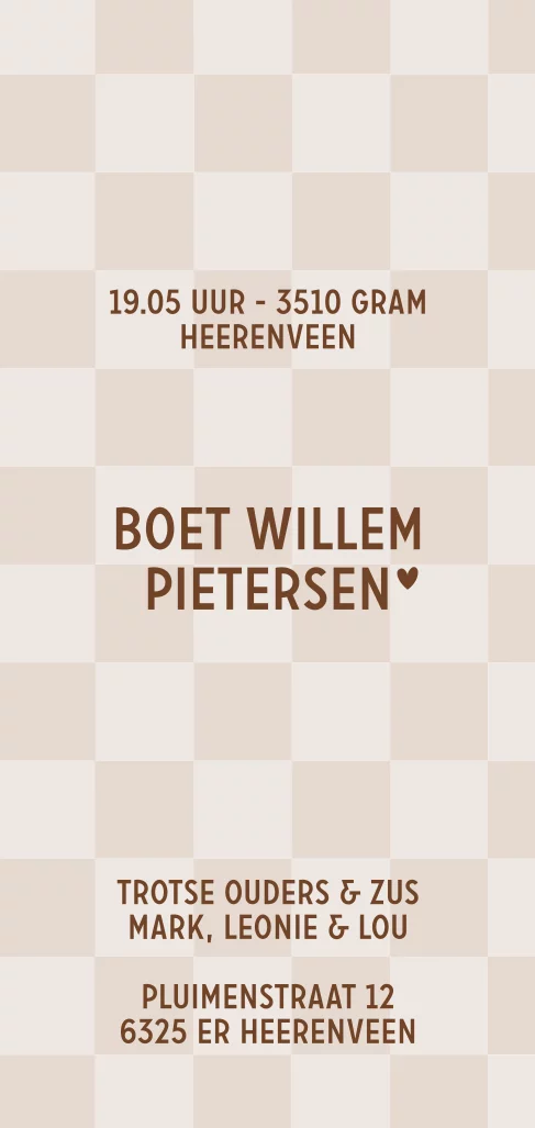Schattig geboortekaartje met een blokjespatroon ookwel checkerboard genoemd. De blokjes zijn in mooie nude kleuren om het geheel rustig maar toch speciaal te maken.