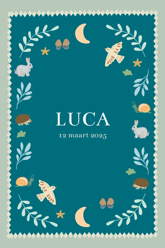 Mooi geboortekaartje met bosdiertjes, takjes, een maan en sterretjes. Houd je van het bos of woon je er vlakbij? Dan is dit unieke kaartje iets voor jou!