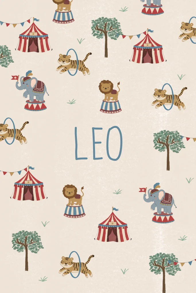Een mooi geboortekaartje voor een jongen met een kleurrijk circus thema. Op het kaartje staan circustenten, olifanten, leeuwen en tijgers.