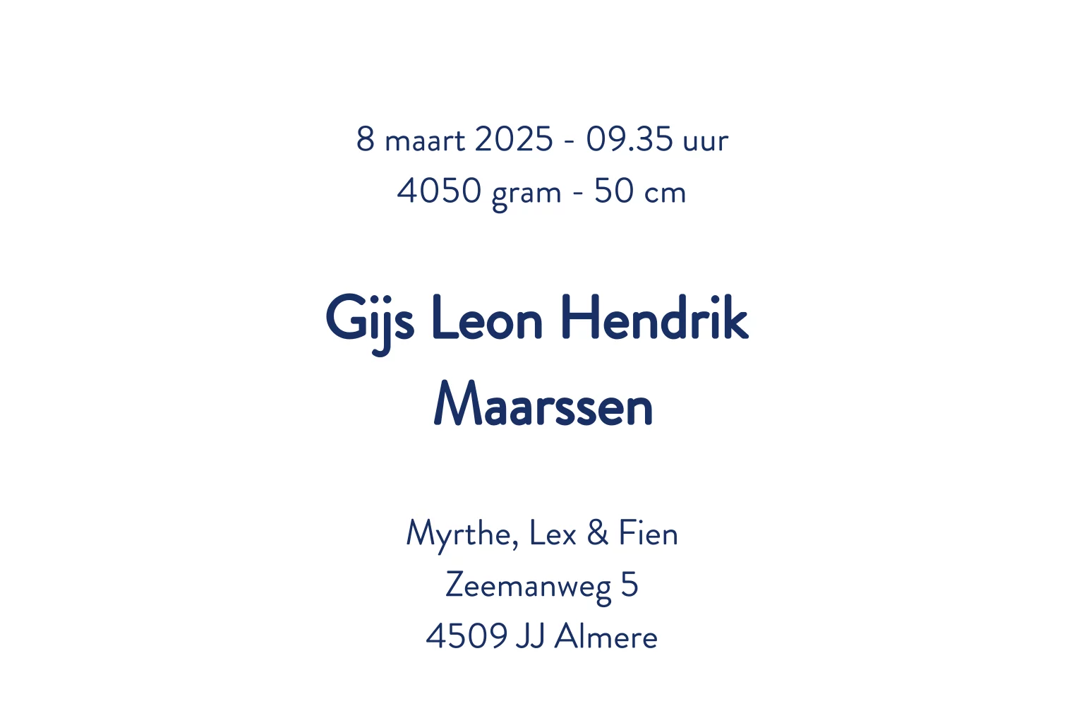 Stoer en simpel geboortekaartje in het donkerblauw met de naam in spot UV lak. Zo is het kaartje speciaal maar toch ook minimalistisch.
